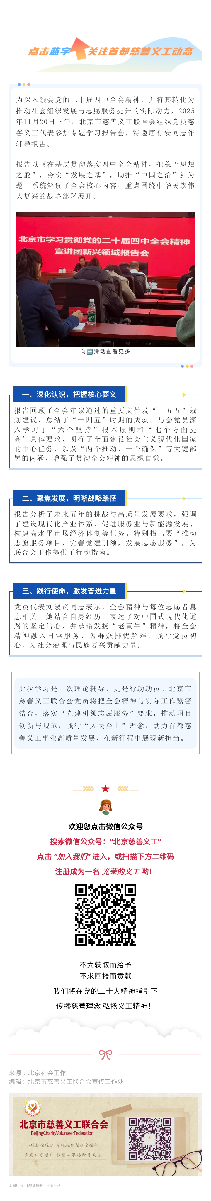 北京市学习贯彻党的二十届四中全会精神宣讲团新兴领域报告会举行——市慈善义工联党员慈善义工代表参与学习